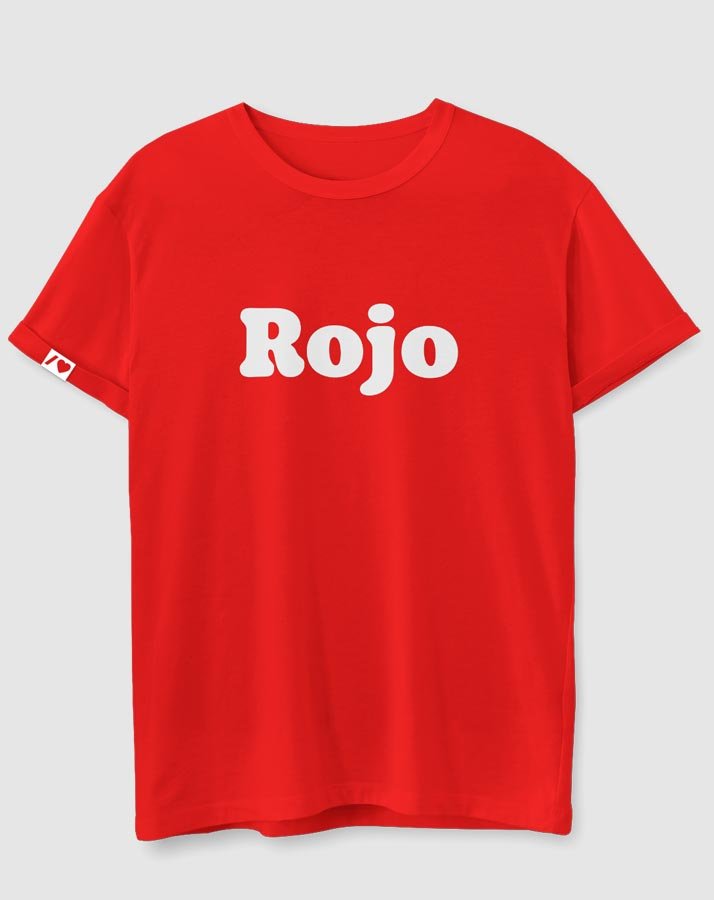 Camiseta color rojo texto “rojo” en blanco y en la manga impreso